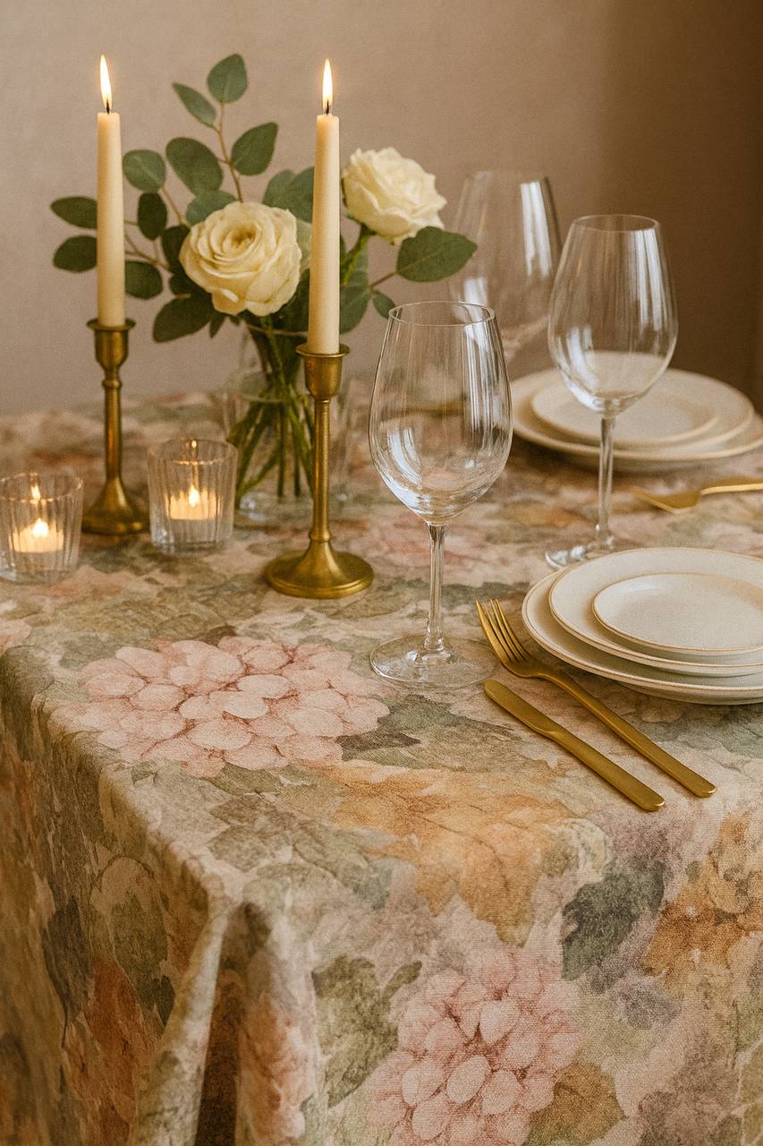Mantel floral cálido en tonos pastel suaves. El estampado acuarela crea comodidad, y la protección de teflón cuida la mesa de manchas y humedad. Ideal para servicios elegantes y románticos.