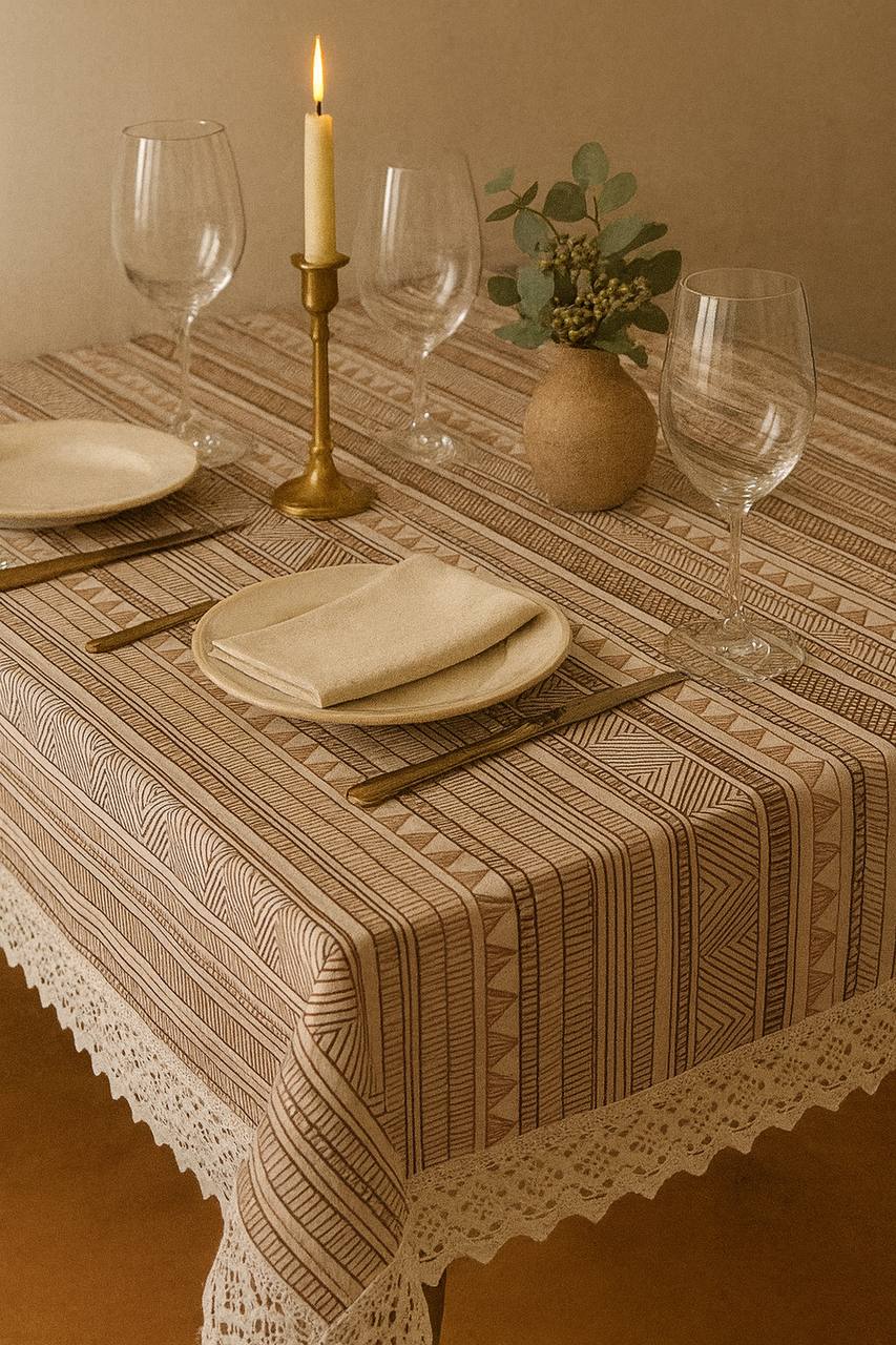 Mantel con patrón geométrico étnico en gama cálida terracota-beige. El encaje blanco en los bordes añade delicadeza, manteniendo el estilo boho y la atmósfera acogedora.