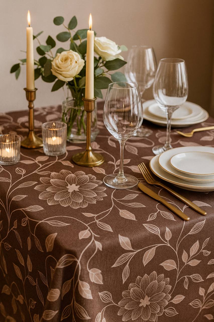 Mantel cálido de café con un elegante diseño floral. Crea comodidad y una atmósfera de calma, y la protección de teflón cuida la mesa de manchas y humedad. Ideal para servicios diarios y cenas familiares acogedoras.