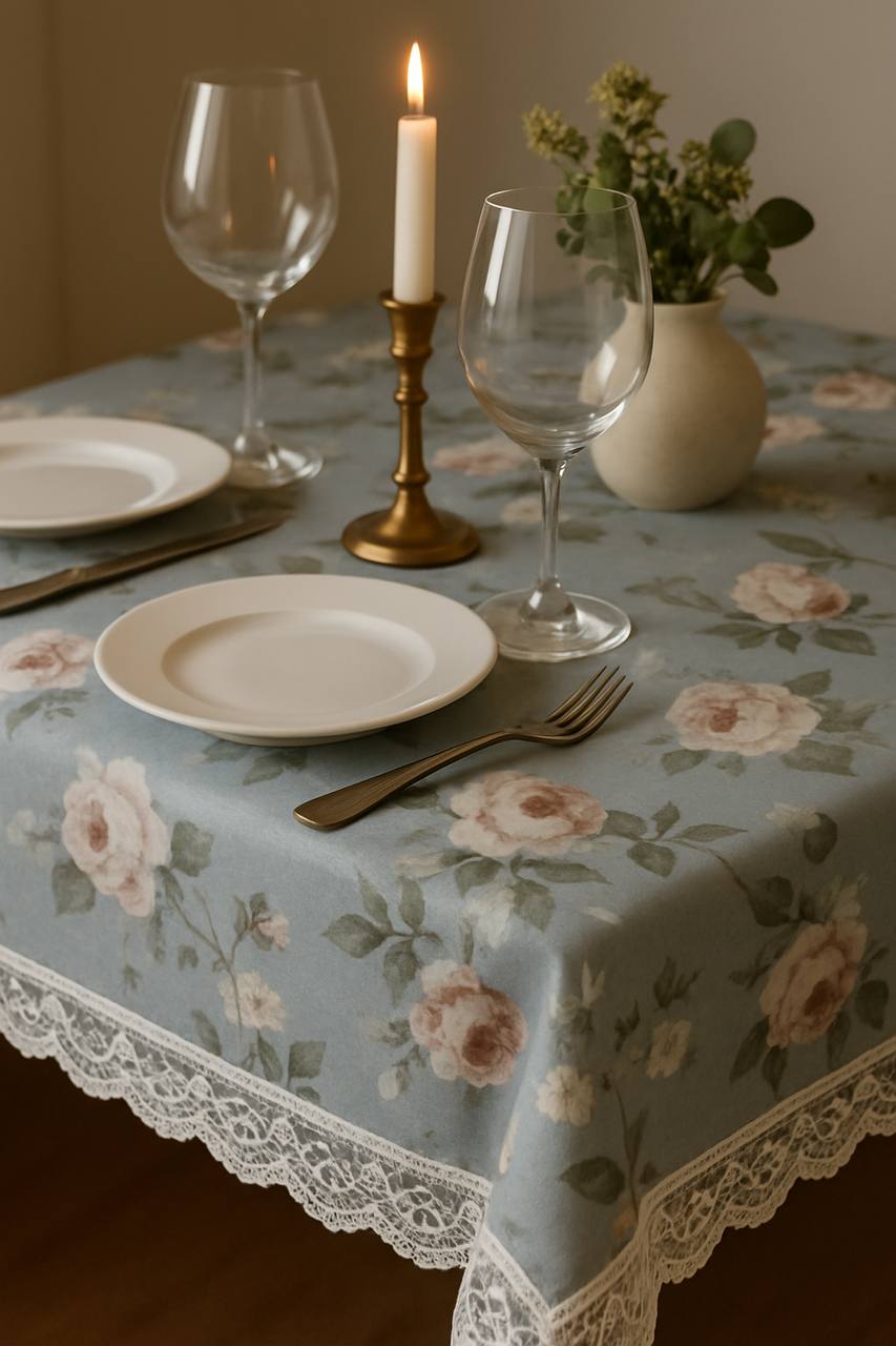 Delicado mantel azul con flores exquisitas y borde de encaje. Crea una atmósfera de ligereza y comodidad, ideal para servicios diarios y festivos.